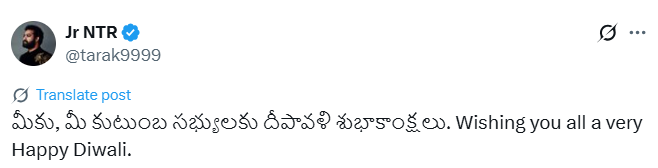 देवरा स्टार जूनियर एनटीआर ने दिवाली की बधाई देते हुए लिखा है, “आप और आपके परिवार को दीपावली की हार्दिक शुभकामनाएं। आप सभी को बहुत-बहुत शुभ दीपावली।”