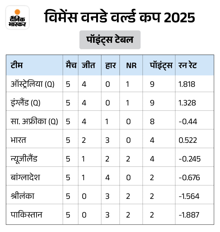 भारत और न्यूजीलैंड मजबूत दावेदार भारत और न्यूजीलैंड की टीमें सेमीफाइनल में पहुंचने की मजबूत दावेदार हैं। दोनों के 5 मैचों में 4 पॉइंट्स हैं। भारत ने श्रीलंका और पाकिस्तान को हराया, लेकिन ऑस्ट्रेलिया, इंग्लैंड और साउथ अफ्रीका से हार का सामना करना पड़ गया। दूसरी ओर, न्यूजीलैंड ने बांग्लादेश को हराया, लेकिन टीम ऑस्ट्रेलिया और साउथ अफ्रीका से हार गई। पाकिस्तान और श्रीलंका के खिलाफ टीम के मुकाबले बेनतीजा रहे। बेहतर रन रेट के कारण भारत चौथे और न्यूजीलैंड पांचवें नंबर पर हैं।