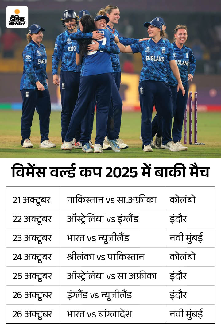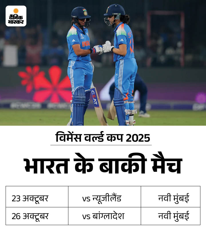 विमेंस वनडे वर्ल्ड कप में सेमीफाइनल की 3 टीमें कन्फर्म हो गई हैं। वहीं बांग्लादेश की टीम नॉकआउट की रेस से बाहर हो चुकी है। सेमीफाइनल के लिए एक जगह खाली है, जिसके लिए भारत और न्यूजीलैंड मजबूत दावेदार है। वहीं पाकिस्तान और श्रीलंका के पास भी क्वालिफाई करने का मौका है।