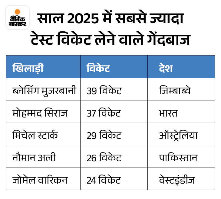 मोहम्मद सिराज को मुजरबानी ने पीछे छोड़ा साल 2025 में टेस्ट क्रिकेट में सबसे ज्यादा विकेट लेने का रिकॉर्ड टीम इंडिया के तेज गेंदबाज मोहम्मद सिराज के नाम था। सिराज ने इस साल अब तक टेस्ट क्रिकेट में 37 विकेट लिए हैं। लेकिन अफगानिस्तान के खिलाफ एकमात्र टेस्ट मैच की पहली पारी में 3 विकेट लेकर ब्लेसिंग मुजरबानी अब सबसे टॉप पर पहुंच चुके हैं। वह 2025 में अब तक टेस्ट में 39 विकेट ले चुके हैं। ब्लेसिंग मुजरबानी ये कारनामा इस साल 10 मैचों की 14 पारियों में किया है। वही,ऑस्ट्रेलिया के मिचेल स्टार्क अभी तीसरे नंबर पर हैं। वहीं 26 विकेट लेने वाले पाकिस्तान के नौमान अली का नाम चौथे नंबर पर मौजूद है। लिस्ट में पांचवें स्थान पर वेस्टइंडीज के जोमेल वॉरिकन का नाम है, जो इस साल 24 विकेट ले चुके हैं। आपको बता दें कि 2025 में दूसरे सबसे ज्यादा टेस्ट विकेट लेने वाले भारतीय गेंदबाज जसप्रीत बुमराह हैं, उन्होंने इस साल अब तक 23 विकेट लिए हैं। ओवरऑल वह इस लिस्ट में सातवें नंबर पर है।