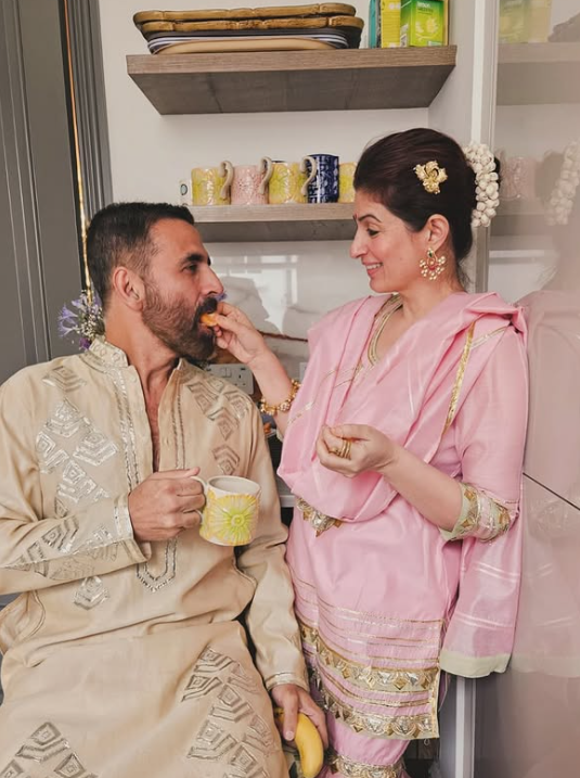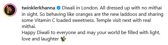 अक्षय कुमार ने इस साल दिवाली लंदन में मनाई है। ट्विंकल ने सेलिब्रेशन की तस्वीरें शेयर करते हुए बताया है कि उन्होंने मिठाई की जगह संतरे खाए हैं। कपल ने तस्वीरों के साथ लिखा है, ‘लंदन में दिवाली। पूरी तरह सजे-धजे हैं लेकिन आस-पास कहीं मिठाई नजर नहीं आ रही। तो हम ऐसे बर्ताव कर रहे हैं जैसे संतरे ही नए लड्डू हों और थोड़ा विटामिन C से भरा मीठापन बांट रहे हैं। अब मंदिर की ओर चल रहे हैं, जहां असली मिठाई मिलेगी। सभी को दीपावली की हार्दिक शुभकामनाएं, आपका संसार प्रेम, प्रकाश और हंसी से भरा रहे।’