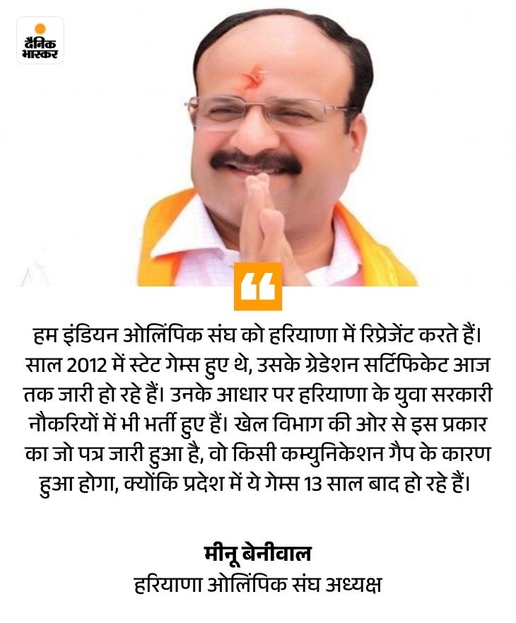अब संघ के इस दावे पर खेल विभाग ने आपत्ति जताते हुए संघ को एक लेटर लिखा है, जिसमें स्पष्ट किया है कि हरियाणा ओलिंपिक संघ के इन खेलों के सर्टिफिकेट पर ग्रेडेशन जारी नहीं होगा। हरियाणा सरकार में गौरव गौतम खेल मंत्री हैं, जबकि हरियाणा ओलिंपिक संघ के अध्यक्ष की जिम्मेदारी मीनू बेनीवाल देख रहे हैं। उनकी हाल ही में सरकार द्वारा इस पद पर नियुक्ति की गई है।