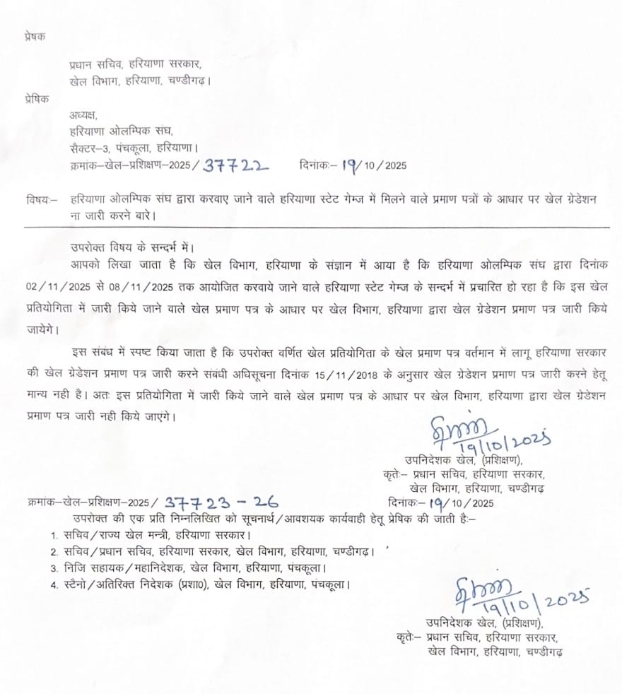 1. HOA प्रचारित कर रहा ग्रेडेशन प्रमाण पत्र की बात खेल विभाग के प्रधान सचिव नवदीप विर्क ने हरियाणा ओलिंपिक संघ (HOA) को 19 अक्टूबर को एक लेटर लिखा है। उसमें उन्होंने कहा है कि खेल विभाग को पता चला है कि HOA 2 नवंबर से 8 नवंबर 2025 तक हरियाणा स्टेट गेम्स करवा रहा है और ये प्रचार कर रहा है कि इस खेल प्रतियोगिता में मिलने वाले सर्टिफिकेट के बेस पर खेल विभाग ग्रेडेशन सर्टिफिकेट देगा।
