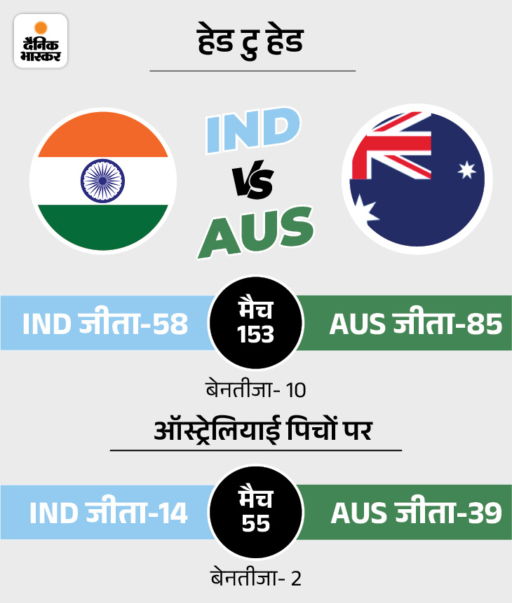ओवरऑल हेड-टु-हेड की बात करें तो भारत-ऑस्ट्रेलिया ने इस मैदान पर कुल 153 मैच खेले हैं। इनमें से 58 मैच जीते, जबकि ऑस्ट्रेलिया के नाम 85 मैच रहे। 10 मुकाबले बेनतीजा रहे। ऑस्ट्रेलियाई पिचों पर भारत ने कंगारुओं के खिलाफ 55 मैच खेले हैं। इनमें से 14 जीते और 39 हारे हैं।