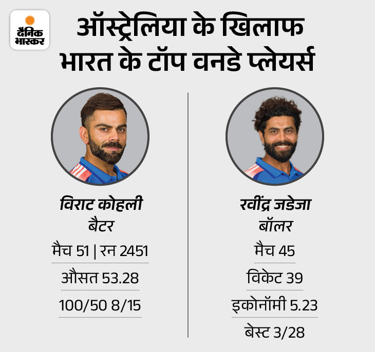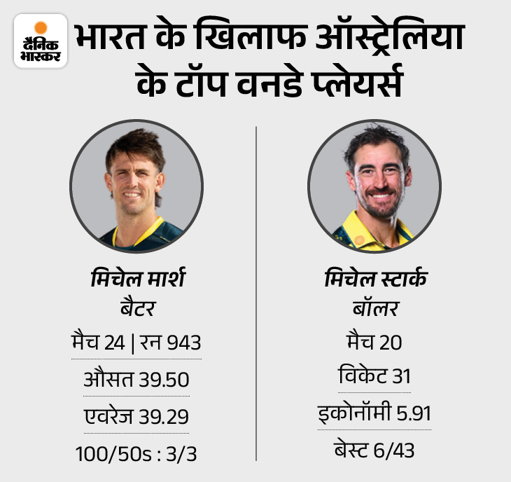 ऑस्ट्रेलिया की मौजूदा टीम में कप्तान मिचेल मार्श ने भारत के खिलाफ सबसे ज्यादा रन बनाए हैं। वे 24 मैच में 39.29 के एवरेज से 943 रन बना चुके हैं। मार्श ने 3 शतक और 3 अर्धशतक लगाए हैं। गेंदबाजी में मिचेल स्टार्क ने 20 मैचों में भारत के 31 विकेट झटके हैं।