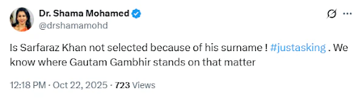 कांग्रेस प्रवक्ता शमा मोहम्मद ने टीम इंडिया के कोच गौतम गंभीर पर बड़ा आरोप लगाया है। उन्होंने सरफराज खान के चयन न होने पर सवाल उठाया है। शमा मोहम्मद ने एक्स पर सवाल उठाया कि क्या सरफराज को उनके उपनाम की वजह से नहीं चुना गया। उन्होंने एक्स पर कहा, क्या सरफराज खान को उनके उपनाम के कारण नहीं चुना गया है। बसपूछ रही हूं। हम जानते हैं कि गौतम गंभीर इस मामले में क्या सोचते हैं।