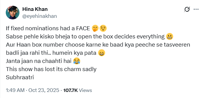 हिना ने अपने ऑफिशियल सोशल मीडिया अकाउंट से नॉमिनेशन टास्क के बाद लिखा है, ‘अगर “फिक्स्ड नॉमिनेशन्स” का चेहरा होता। सबसे पहले किसे बॉक्स खोलने भेजा गया, बस वही सब कुछ तय कर देता है। और हां, बॉक्स नंबर चुनने के बाद कहीं पीछे से तस्वीरें बदली तो नहीं जा रहीं थीं, हमें क्या पता, जनता जानना चाहती है, अब इस शो का जादू सच में खो गया है।’