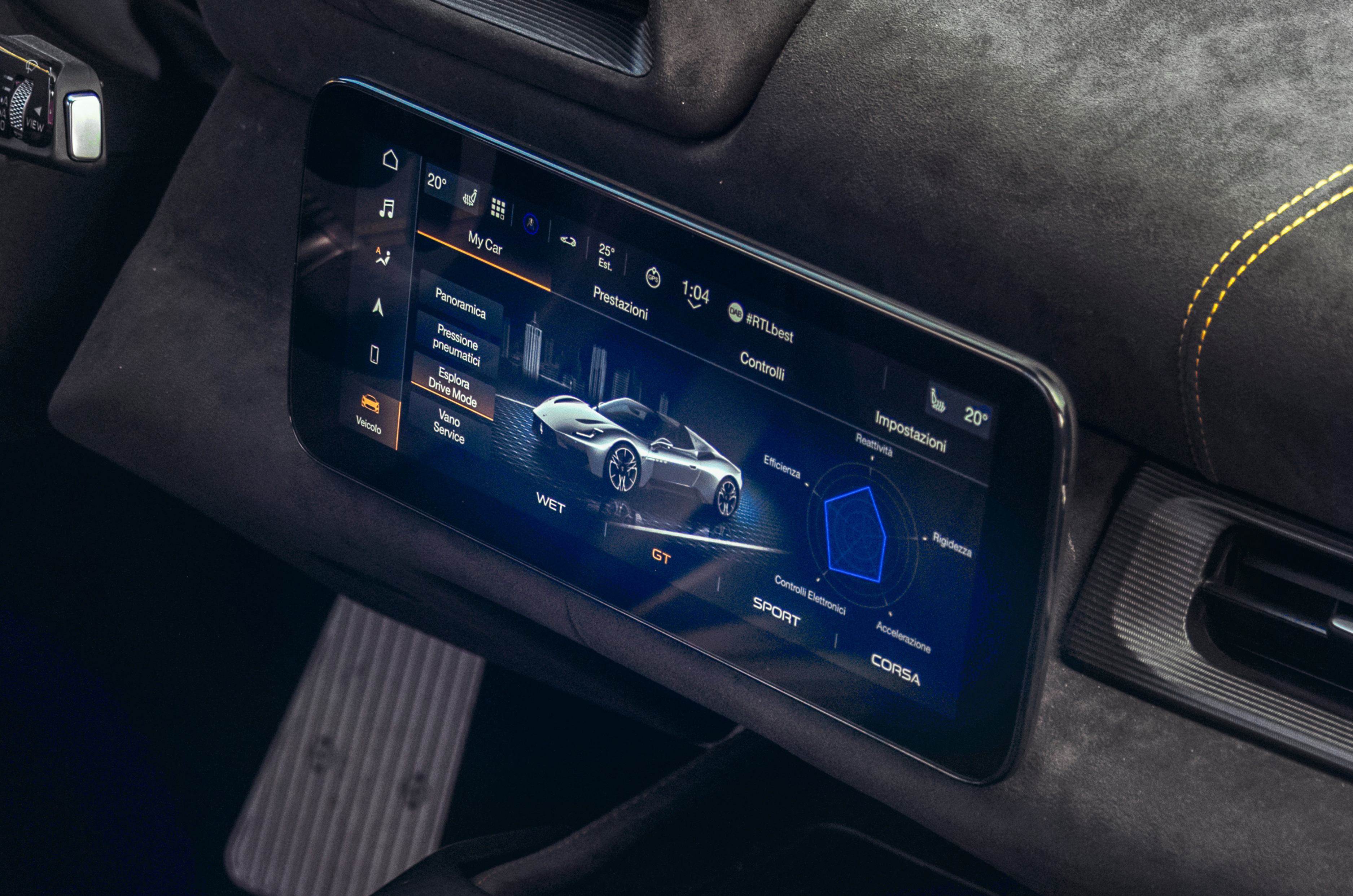 Buttons are down to a minimum, with just ‘Drive’ and ‘Reverse’ on the thin centre console, below a context-sensitive twist-dial to select drive and suspension modes. The starter button and crucial nose-lift function are operated via the steering wheel, and there are two slender shift paddles mounted to the column. Everything else is crammed into the 10.25-inch touchscreen, including the roof controls for the convertible, which is frustrating to use on the go.