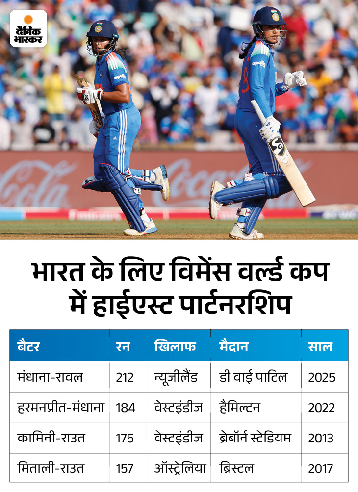 5. मंधाना-प्रतिका ने वर्ल्ड कप में भारत के लिए सबसे बड़ी साझेदारी की स्मृति मंधाना और प्रतिका रावल ने मिलकर 212 रन की ओपनिंग साझेदारी की। यह विमेंस वर्ल्ड कप के इतिहास में भारत की सबसे बड़ी साझेदारी है। इससे पहले 2022 हैमिल्टन में स्मृति मंधाना और हरमनप्रीत कौर ने वेस्टइंडीज के खिलाफ 184 रन की साझेदारी की थी।