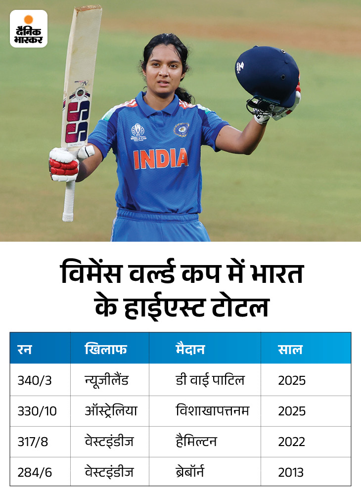 1. विमेंस वनडे वर्ल्ड कप में भारत का हाईएस्ट टोटल भारतीय विमेंस टीम ने वनडे वर्ल्ड कप में अपना हाईएस्ट टोटल बनाया। टीम ने 49 ओवर की बल्लेबाजी की और 3 विकेट खोकर 340 रन बनाए। इससे पहले इसी वर्ल्ड कप में ही भारत ने ऑस्ट्रेलिया के खिलाफ 330 का स्कोर बनाया था। हालांकि भारत यह मैच हार गई थी।