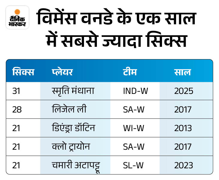 3. मंधाना एक साल में सबसे ज्यादा सिक्स लगाने वाली विमेंस स्मृति मंधाना विमेंस वनडे के एक साल में सबसे ज्यादा सिक्स लगाने वाली बैटर बन गईं। उन्होंने इस साल अब तक 31 सिक्स लगा दिए हैं। दूसरे नंबर पर साउथ अफ्रीका की लिजेल ली हैं। 2017 में लिजेल ने 28 सिक्स लगाए थे।