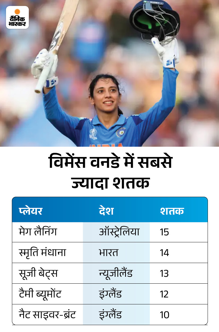 2. मंधाना दूसरी सबसे ज्यादा शतक लगाने वाली बैटर विमेंस वनडे क्रिकेट में स्मृति मंधाना दूसरी सबसे ज्यादा शतक लगाने वाली बैटर बन गईं। उनके नाम अब 14 शतक हो गए हैं। ऑस्ट्रेलिया की मेग लैनिंग 15 शतक के साथ पहले नंबर पर हैं।अगर तीनों फॉर्मेट की बात की जाए तो स्मृति ने मेग लैनिंग की बराबरी कर ली है। अब दोनों के नाम 17-17 सेंचुरी हैं।