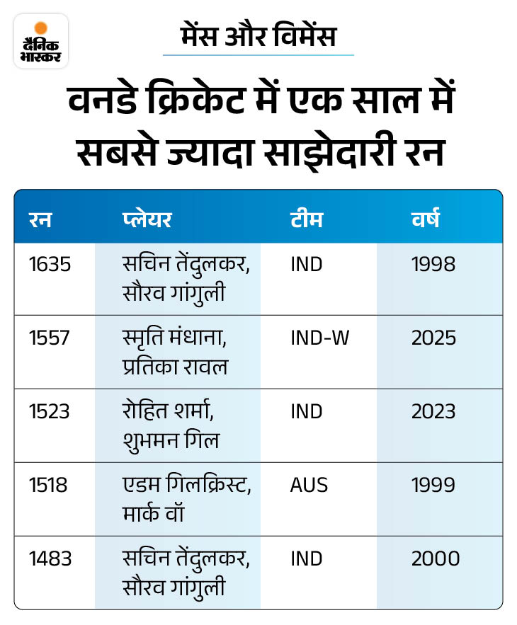 6. स्मृति मंधाना और प्रतिका रावल ने इस साल 1557 रन जोड़े इंडियन विमेंस ओपनर स्मृति मंधाना और प्रतिका रावल की जोड़ी 2025 में अब तक 1557 रन जोड़ चुकी हैं। यह जोड़ी मेंस और विमेंस दोनों को मिलाकर किसी एक साल में सबसे ज्यादा रन बनाने के मामले में दूसरे नंबर पर पहुंच गई हैं। इस लिस्ट में उनसे आगे सिर्फ सचिन तेंदुलकर और सौरव गांगुली हैं। दोनों ने 1998 में 1635 रन बनाए थे।