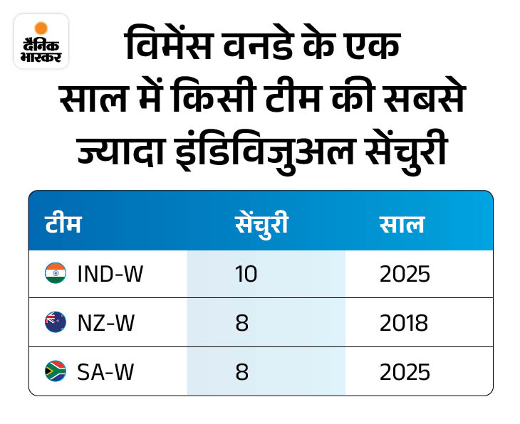 मंधाना ने एक साल में सबसे ज्यादा शतक लगाने के मामले में साउथ अफ्रीका की तजमीन ब्रिट्स की भी बराबरी की। दोनों ने इस साल अब तक 5-5 शतक लगाए हैं। 2024 में मंधाना ने 4 शतक लगाए थे।