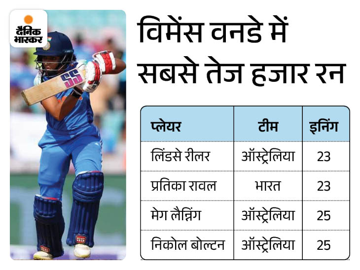 4. प्रतिका ने सबसे तेज हजार रन का रिकॉर्ड बनाया प्रतिका रावल ने वनडे में अपने एक हजार रन पूरे कर लिए। इसके लिए उन्होंने 23 पारियां लीं। विमेंस वनडे में सबसे तेज हजार रन बनाने के मामले में उन्होंने ऑस्ट्रेलिया की लिंडसे रीलर की बराबरी की।