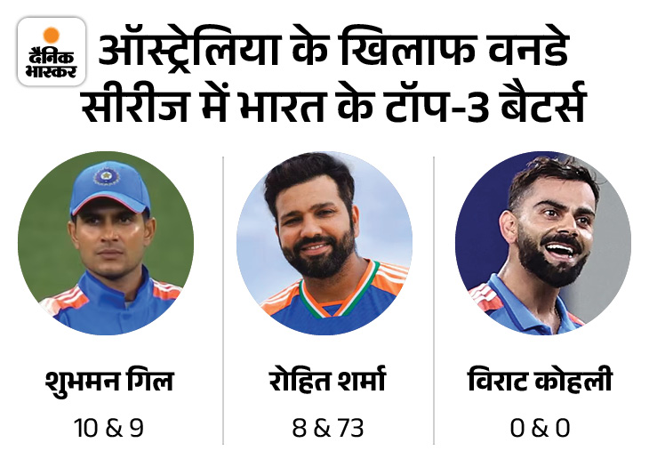 वनडे क्रिकेट को टॉप-3 बल्लेबाजों का खेल कहा जाता है। ऊपर के तीन में से एक बल्लेबाज भी शतक जमा दे तो टीम का बड़ा स्कोर लगभग तय रहता है, लेकिन भारत के टॉप-3 दोनों मैच में कुछ कमाल नहीं कर सके। कप्तान शुभमन गिन ने पर्थ में 10 और एडिलेड में 9 रन बनाए। विराट कोहली दोनों बार जीरो पर आउट हुए। रोहित शर्मा ने एडिलेड में अच्छी बल्लेबाजी की, लेकिन पर्थ में वे भी फेल रहे थे। यानी दो मैचों में भारत के टॉप-3 बल्लेबाजों की कुल 6 पारियों में सिर्फ एक हाफ सेंचुरी आई। 2 मैच मिलाकर तीनों प्लेयर्स 100 रन ही बना सके।