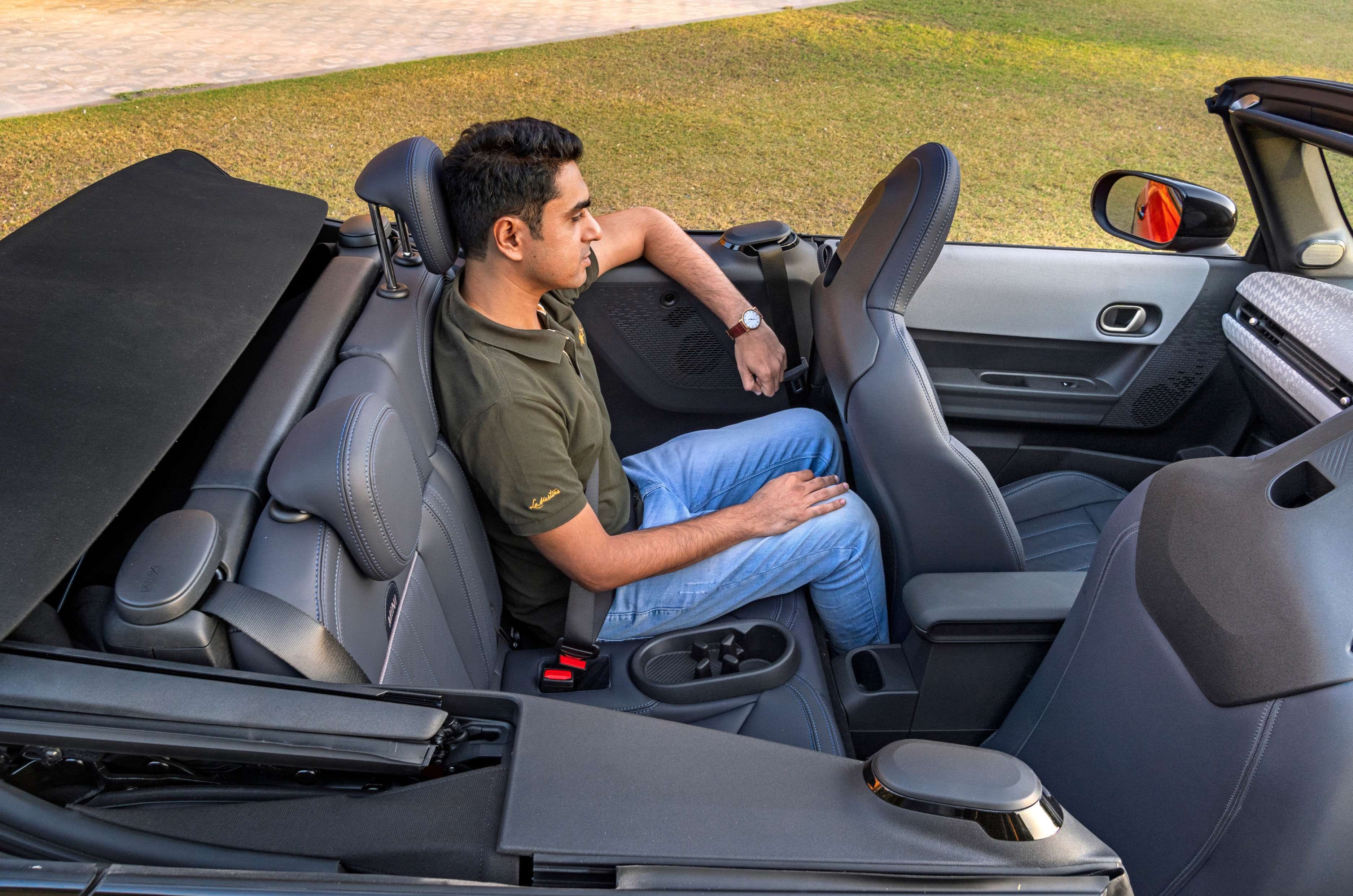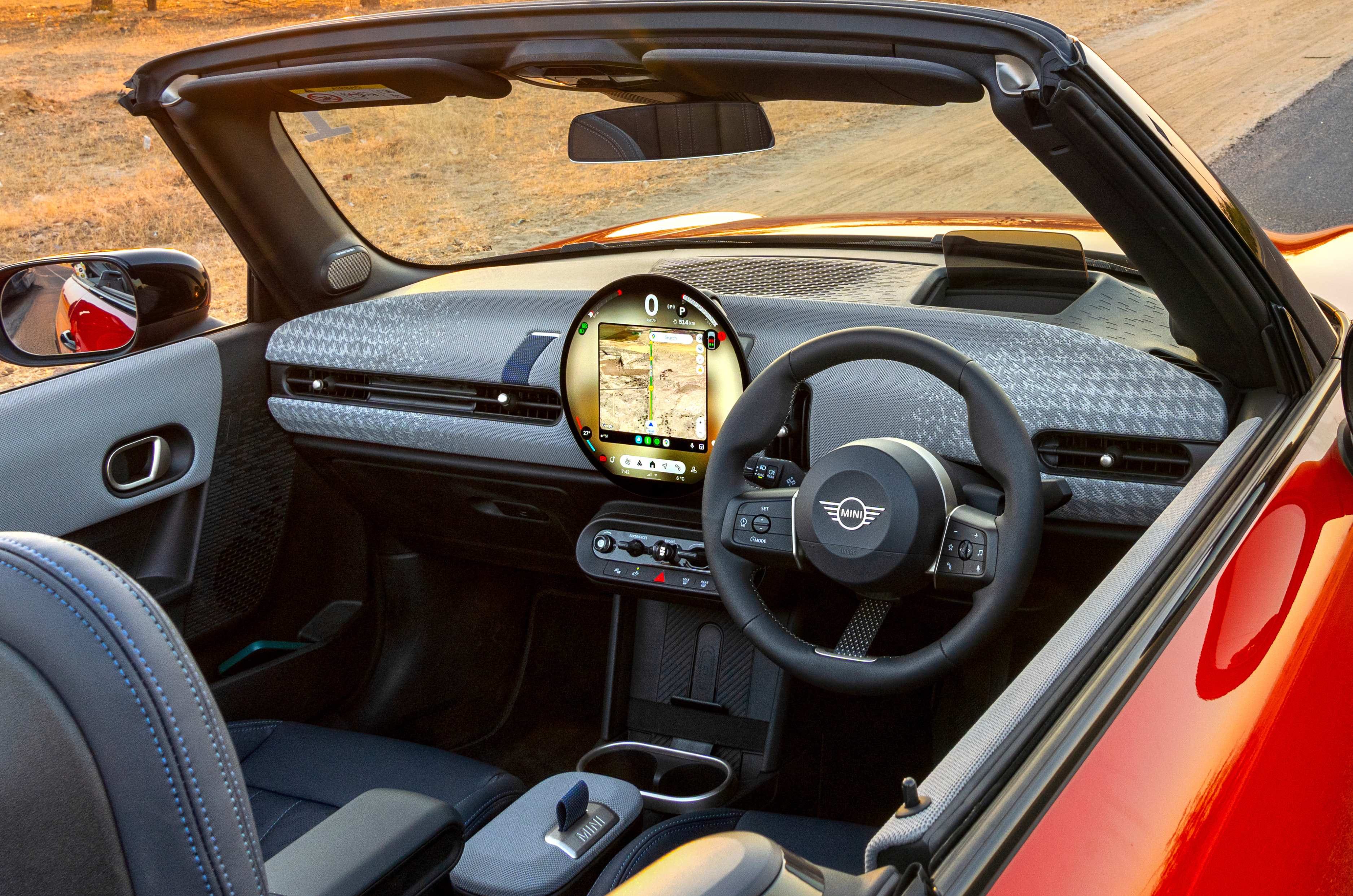 The cabin layout is distinctive, with a 9.4-inch circular OLED touchscreen, fabric panel on the dashboard, ambient lighting and a head-up display. The Convertible also comes with a solid list of features, including Android Auto and Apple CarPlay, a 12-speaker 365W Harman Kardon audio system, a powered driver’s seat with massage function, heated steering and drive modes.