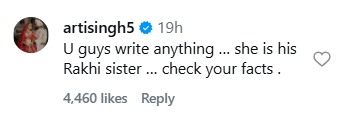 इस वीडियो पर आरती सिंह ने भड़कते हुए कमेंट कर लिखा, ‘तुम लोग कुछ भी लिखते हो, ये उसकी राखी बहन है। अपने फैक्ट्स चैक कर लो।’