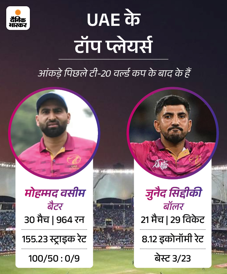 वसीम ने टीम के लिए सबसे ज्यादा रन बनाए UAE की सबसे बड़ी ताकत उसका घरेलू फायदा है। कप्तान मोहम्मद वसीम की आक्रामक बल्लेबाजी और स्पिन विकल्प उन्हें मजबूत बनाते हैं। टीम के पास ऐसे गेंदबाज हैं जो बीच के ओवरों में दूसरी टीम पर दबाव बना सकते हैं। हालांकि, टीम की सबसे बड़ी कमजोरी है कि शुरुआती विकेट गिरने के बाद मिडिल ऑर्डर दबाव झेल नहीं झेल पाता है। पाकिस्तान के खिलाफ भी ऐसा देखने को मिला।