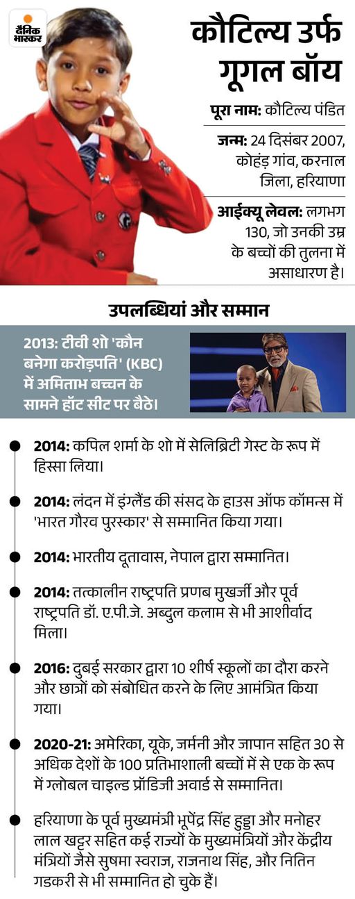 - टीचर ने एटलस दी, कुछ देर में ही याद कर ली : कौटिल्य पंडित साल 2007 में करनाल के कोहंड गांव में हुआ। दादा जय किशन शर्मा प्रसिद्ध शिक्षाविद रहे हैं। सोनीपत के शंभू दयाल स्कूल में पढ़ाते थे। कौटिल्य करीब 4-5 साल का था। स्कूल में टीचर से मिली एटलस (मानचित्रों का संग्रह) को कुछ देर में ही याद कर लिया। बस यहीं से दादा ने बच्चे की प्रतिभा पहचान ली। कौटिल्य दादा को अपना सच्चा दोस्त और गुरु मानते हैं।