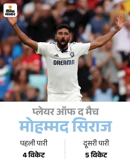 ओवल टेस्ट में 9 विकेट झटके थे सिराज ने पहली पारी में 4 विकेट और दूसरी पारी में 5 विकेट लिए। उनके शानदार प्रदर्शन की बदौलत भारत ने ओवल टेस्ट जीता और सीरीज 2-2 से बराबर की। उन्हें ‘प्लेयर ऑफ द मैच’ चुना गया।