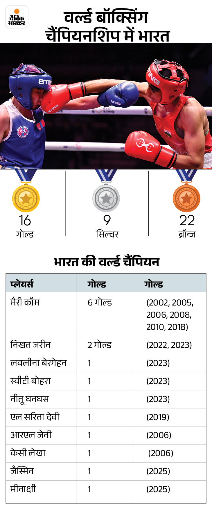 मीनाक्षी के इस गोल्ड के साथ भारत के वर्ल्ड चैंपियंस की संख्या डबल डिजिट में पहुंच गई है। वे वर्ल्ड बॉक्सिंग चैंपियनशिप की विमेंस कैटेगरी में गोल्ड मेडल जीतने वाली भारत की 10वीं मुक्केबाज हैं।