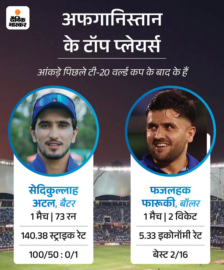 अटल ने हॉन्ग कॉन्ग के खिलाफ नाबाद 73 रन बनाए थे अफगानिस्तान के लिए पहले मैच में हॉन्ग कॉन्ग के खिलाफ सेदिकुल्लाह अटल ने नाबाद 73 रन बनाए थे। उनके अलावा अजमतुल्लाह उमरजई ने 53 और मोहम्मद नबी ने 33 रन की पारी खेली थी। फजलहक फारुकी और गुलबदीन नाइब को 2-2 विकेट मिले।