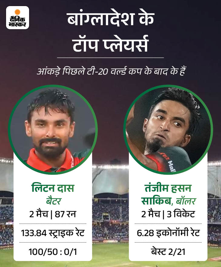 लिटन दास ने पहले मैच में अर्धशतक लगाया था बांग्लादेश ने इस एशिया कप में दो मैच खेले हैं। कप्तान लिटन दास टीम के टॉप स्कोरर हैं। उन्होंने हॉन्ग कॉन्ग के खिलाफ पहले मैच में 39 बॉल पर 59 रन बनाए थे। वहीं, बॉलिंग में तंजीम हसन साकिब टॉप हैं।