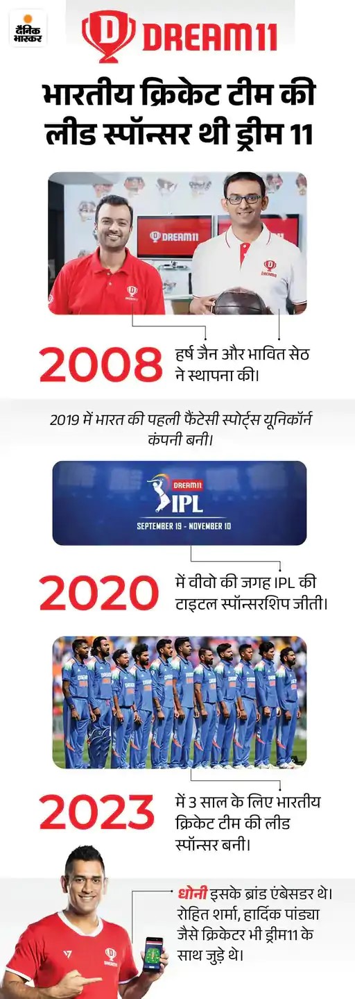 ड्रीम-11 ने हाल ही में टीम इंडिया की स्पॉन्सरशिप से अलग होने का फैसला ऑनलाइन गेमिंग बिल पास होने के बाद लिया था। बिल में गेमिंग प्लेटफॉर्म्स को बैन किया गया है।
