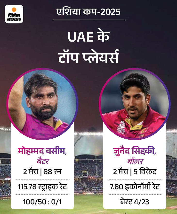 कप्तान वसीम से फिर अच्छे प्रदर्शन की उम्मीद यूएई की टीम से मोहम्मद वसीम, अलीशान शराफू, हैदर अली, और जुनैद सिद्दकी अपने प्रदर्शन से सभी का ध्यान खीच सकते हैं। कप्तान वसीम टीम के टॉप रन स्कोरर हैं। टीम को उनसे आज भी उम्मीद होगी। जुनैद सिद्दीकी ने सबसे ज्यादा विकेट झटके हैं।