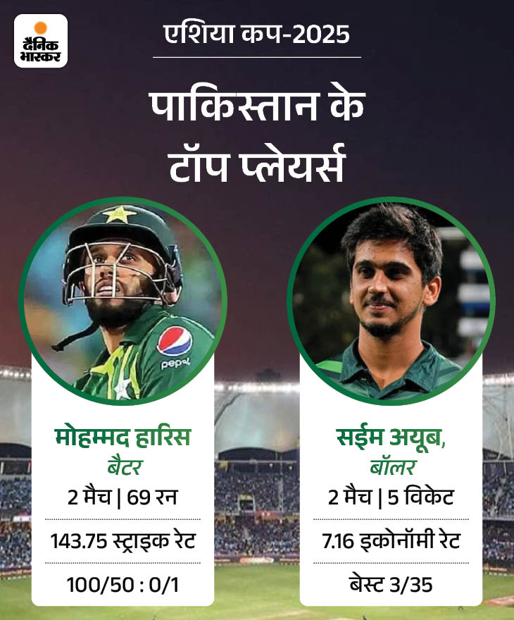 सईम अयूब पर होंगी सबकी निगाहें पाकिस्तान की टीम से सईम अयूब, फखर जमान, मोहम्मद नवाज, मोहम्मद हारिस और शाहीन अफरीदी स्टार प्लेयर हो सकते हैं जिन पर सभी की निगाहें रहेंगी। टीम के लिए टूर्नामेंट में मोहम्मद हारिस ने सबसे ज्यादा रन और सईम अयूब ने सबसे ज्यादा विकेट लिए हैं।