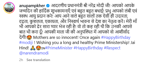 आदरणीय प्रधानमंत्री श्री नरेंद्र मोदी जी! आपको आपके जन्मदिन की हार्दिक शुभकामनाएं एवं बहुत बहुत बधाई! प्रभु आपको लंबी एवं स्वस्थ आयु प्रदान करे! आप आने वाले बहुत सालों तक ऐसी ही उदारता, दृढ़ता, कुशलता, एकाग्रता, और निस्वार्थ भावना से देश का नेतृत्व करें। मेरी मां भी आपको ढेर सारा प्यार भेज रही है! वो तो कह रही थी कि उनकी आपसे बात भी करा दूं! आपकी माता जी की अनुपस्थित में आपको वो आशीर्वाद देगी!