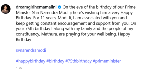 हमारे प्रधानमंत्री श्री नरेंद्र मोदी जी के जन्मदिन के मौके पर उन्हें बहुत-बहुत शुभकामनाएं। मोदी जी, मैं पिछले 11 सालों से आपके साथ जुड़ी हूं और हमेशा आपका समर्थन और प्रोत्साहन मिलता रहा है। आपके 75वें जन्मदिन पर मैं, अपने परिवार और अपनी निर्वाचन क्षेत्र मथुरा के लोगों के साथ आपकी अच्छी सेहत और खुशहाली की प्रार्थना करती हूं। जन्मदिन की बहुत-बहुत शुभकामनाएं।