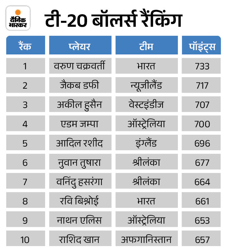 पहली बार वरुण चक्रवर्ती टॉप बॉलर बने हैं। वरुण टी-20 रैंकिंग में नंबर-1 बॉलर बनने वाले तीसरे भारतीय प्लेयर हैं। उनसे पहले जसप्रीत बुमराह और रवि बिश्नोई यह उपलब्धि हासिल कर चुके हैं।