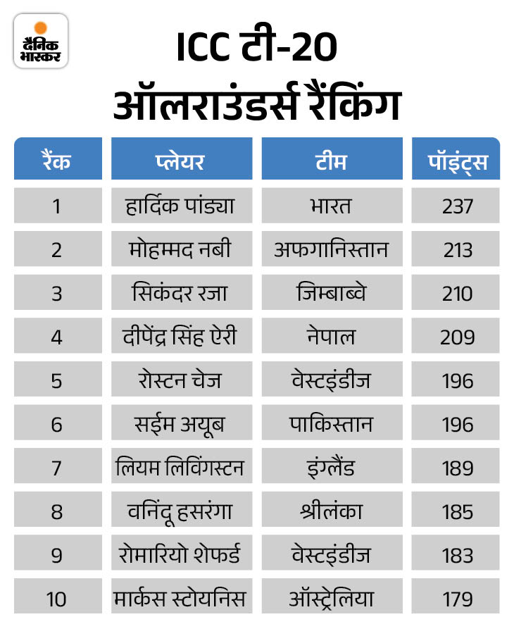 ऑलराउंडर्स की रैंकिंग में पंड्या पहले नंबर पर भारतीय स्टार हार्दिक पंड्या टी-20 इंटरनेशनल ऑलराउंडर्स की रैंकिंग में पहले नंबर पर बने हुए हैं। जबकि पाकिस्तान के सईम अयूब चार स्थान ऊपर चढ़कर पांचवें स्थान पर और अभिषेक चार स्थान ऊपर चढ़कर 14वें स्थान पर पहुंच गए हैं।
